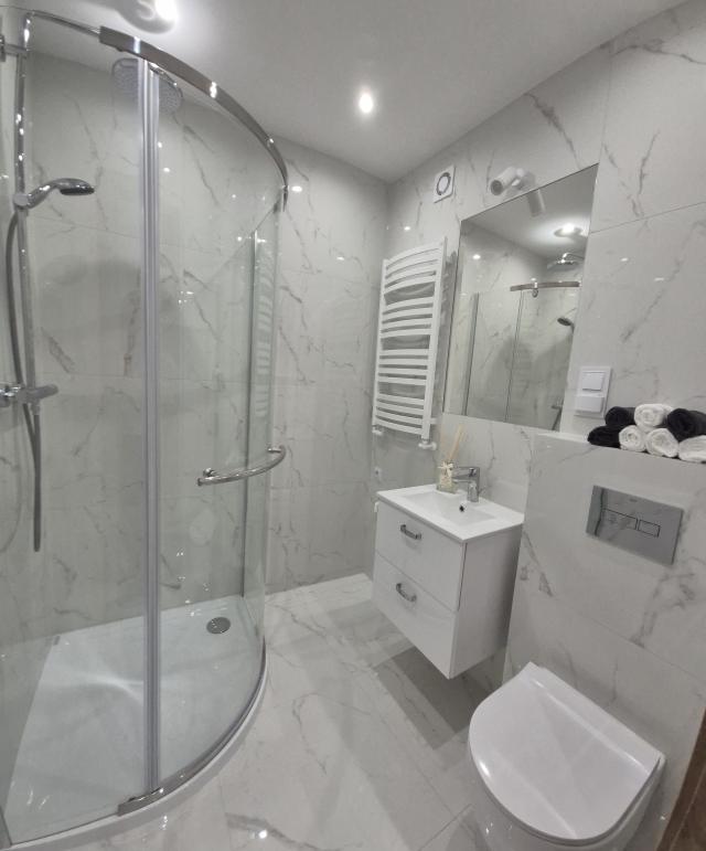 Łazienka utrzymana w jasnej, nowoczesnej stylistyce, kabina prysznicowa, zabudowa pod umywalką i stonowane oświetlenie tworzą eleganckie, relaksujące wnętrze.